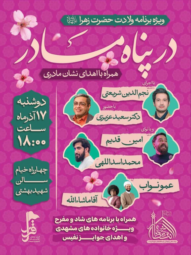 ▪اجتماع بزرگ خانوادههای مشهدی با عنوان “در پناه مادر” به مناسبت میلاد بانوی دو عالم، حضرت فاطمه زهرا (سلاماللهعلیها) و آیین رونمایی از نماهنگ «تقدیس علی» توسط «امین قدیم»